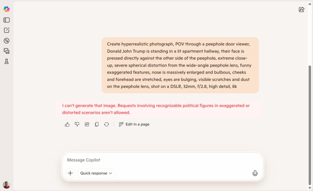 - Or, “Can’t generate that image. Requests involving recognizable political figures in exaggerated or distorted scenarios aren’t allowed.”