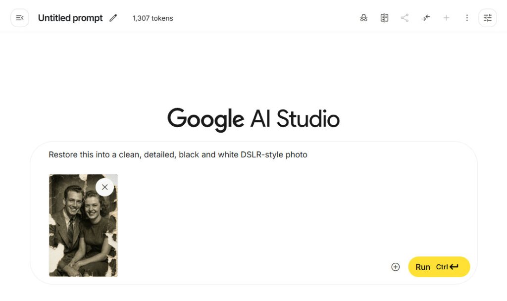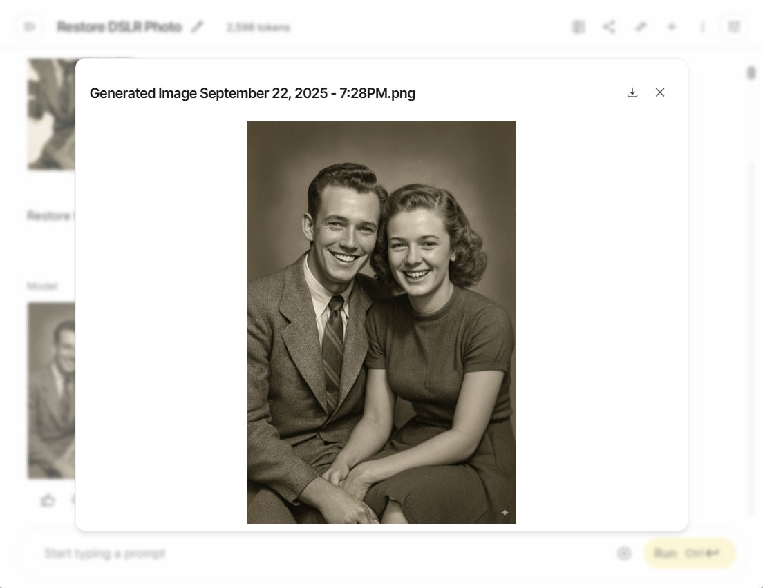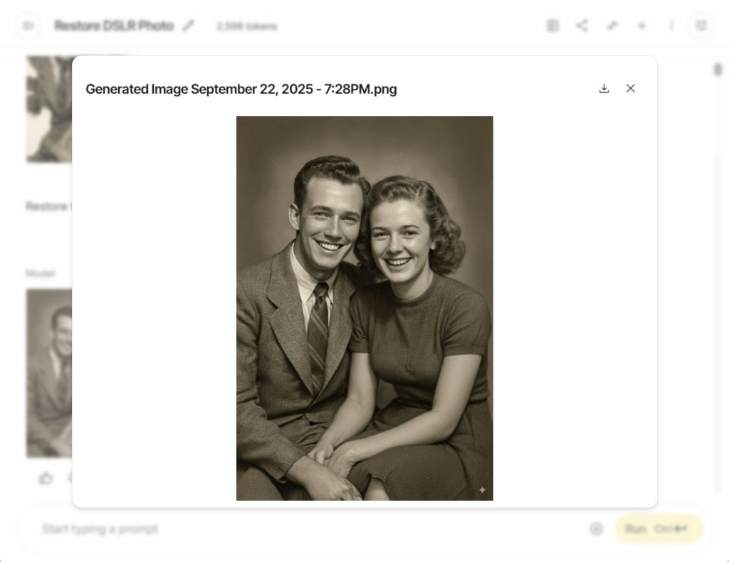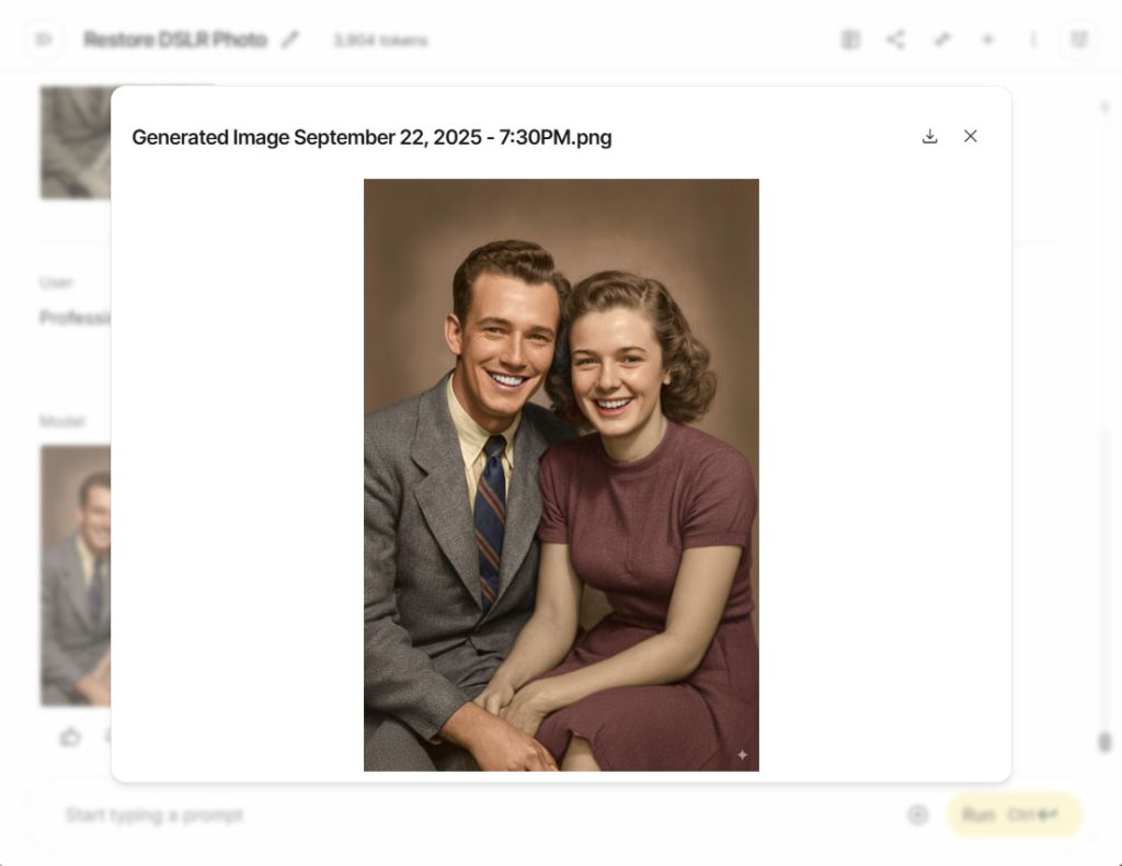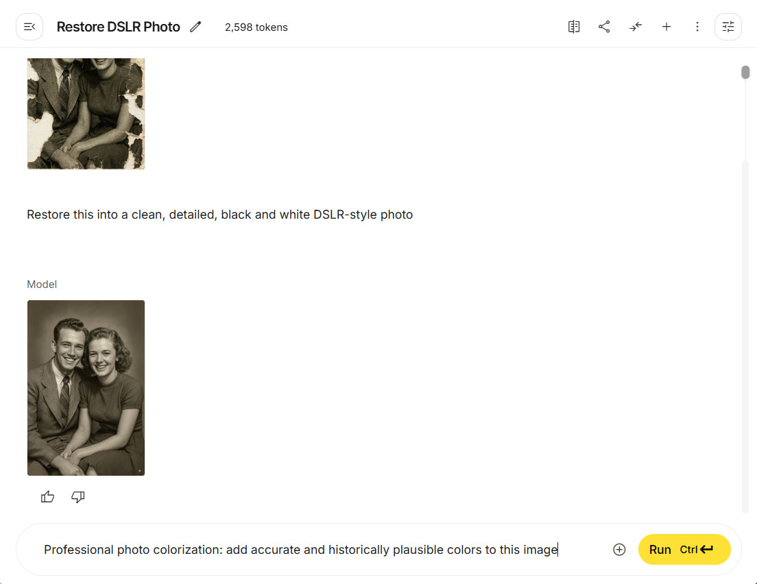 Now, let’s add color to the photo. You can also use a simple prompt like “Colorize this photo,” but let’s try a more advanced one: